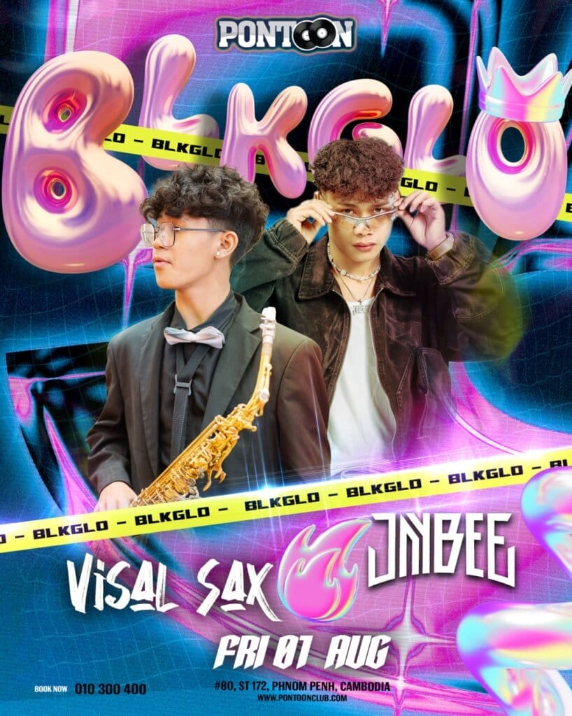 BLKGLO ’bout to flip the switch! 💥 Live sax from Visal Sax 🎷, JayBee cookin’ up club fire. 🔥 No chill night, just straight heat, Aug 1st at Pontoon. 💯